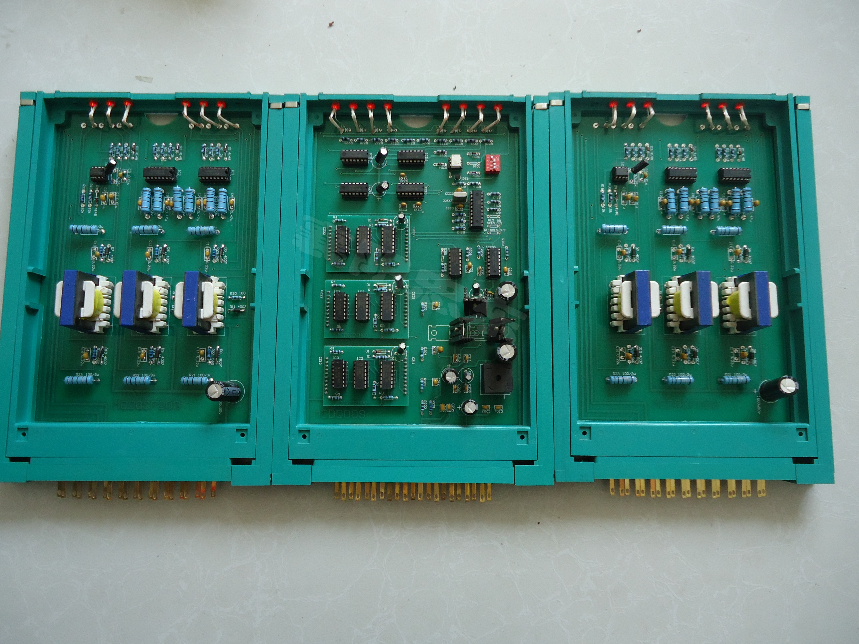 控制板共有三塊,中間一塊一般稱為主控板,兩邊的一般稱為觸發(fā)板??刂瓢甯鼡Q必須先斷開進相器電源,主控板內(nèi)有四個撥碼開關(guān),其作用是切換進相器的運行(電機運轉(zhuǎn))和試驗狀態(tài)(電機不運轉(zhuǎn)),調(diào)整撥碼開關(guān)時,必須斷開空氣開關(guān)。